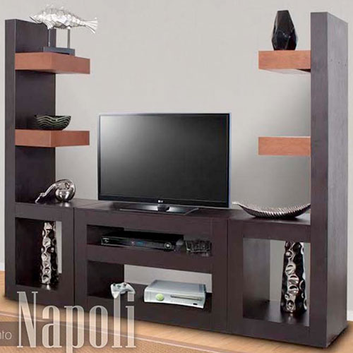 Centro de entretenimiento de 3 modulos doble vista, 2 torres y 1 mueble para tv. Color chocolate grabado con nogal.