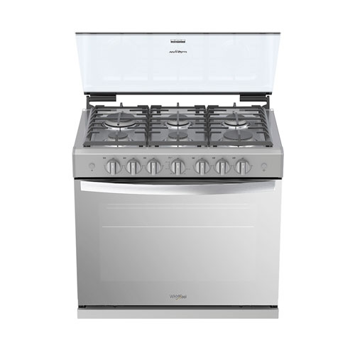 Capelo de cristal templado, cubierta de Acero Inoxidable, panel frontal, 3 parrillas de hierro fundido y 6 quemadores. Horno con parrilla sencilla, tecnología EverClean para fácil limpieza, puerta panorámica y Door Stop System.