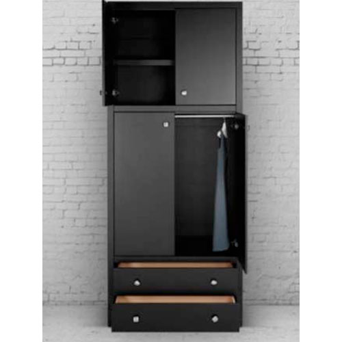 Ropero alto color chocolate, con colgador, 2 cajones y repisas en la parte superior.