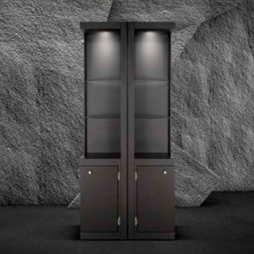 Librero torre con entrepaños y puerta color chocolate, cuenta con luz decorativa superior.